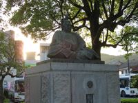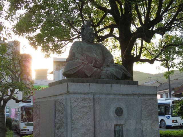 駅の北側には、小早川隆景の像が目立たないように建っています。