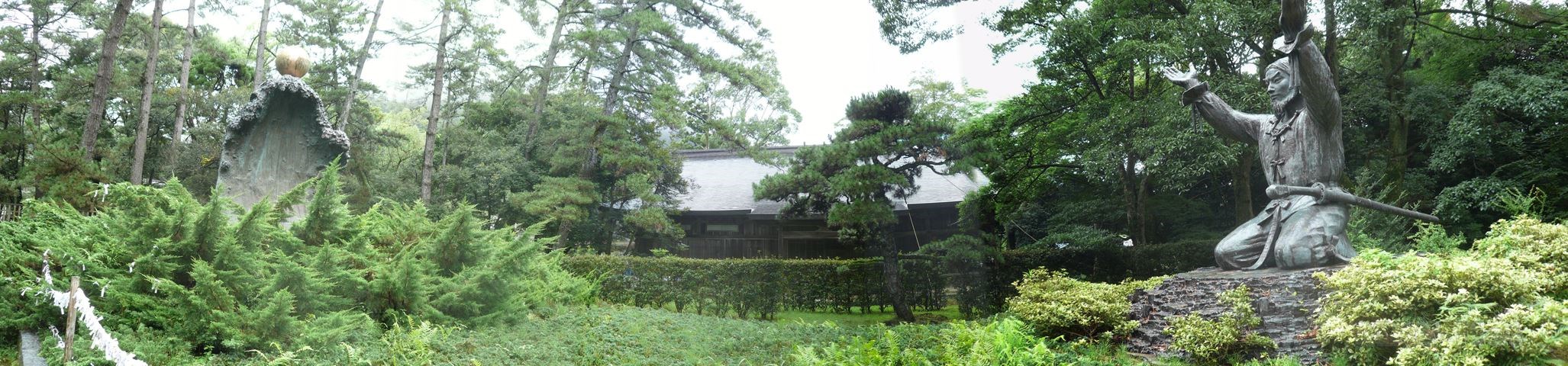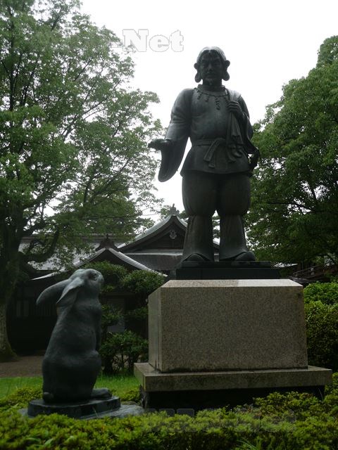 すこし開けたところの両脇には、左手に因幡の白兎を再現した御慈愛の像、右手には 大国主命が海神から幸魂奇魂(さちみたまくしみたま)を授かるムスビの御神像があります。