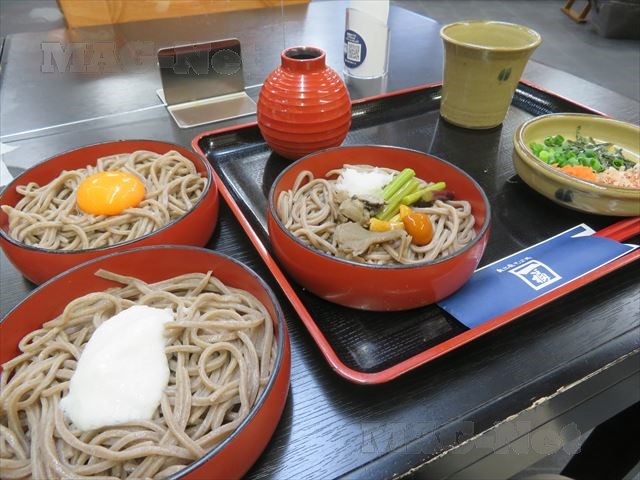 3段の丸い器にそばが盛られており、上の器から順に食べて行きます。