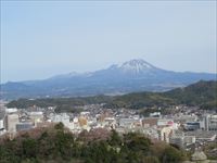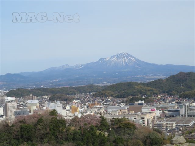 遠くに雪を被った大山の山々が、その手前には米子の町が広がっています。