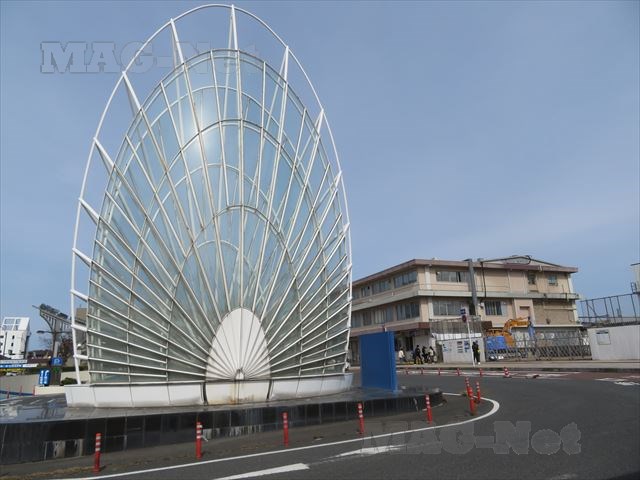 駅反対側の東口には、型蒸気機関車C57の車輪も展示されています。