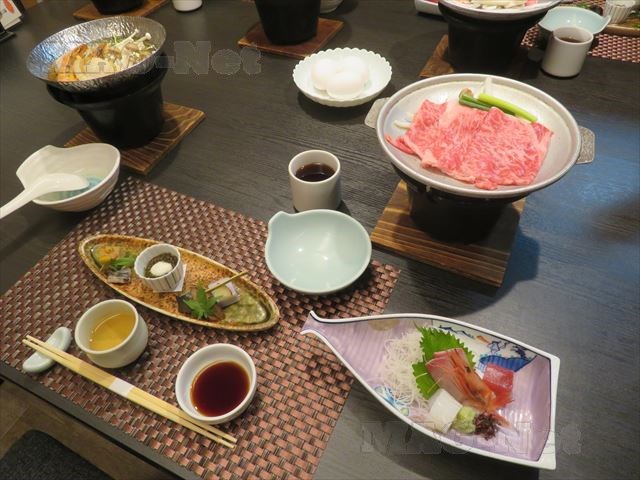 刺身や鍋になったホタテ、それに牛の陶板焼きがまず用意されています。