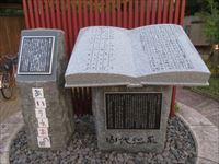 山門の外には、本を開いたような変わった形の石碑があります。