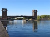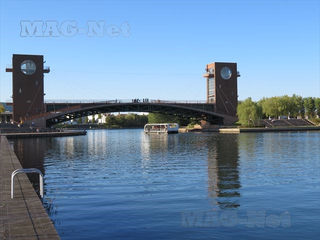 そして人魚の視線の先には、パナマ運河のように水面の高低差を利用して船を通す「中島閘門」があります。