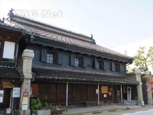 北海道との廻船の商いで巨万の富を築いた商家で、土蔵造り2階建ての外観は黒漆喰で仕上げられています。