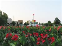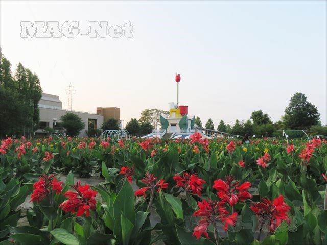 ここが「砺波チューリップ公園」の中心で、春にはこの柱を中心に一面ののチューリップのじゅうたんを見ることができます。