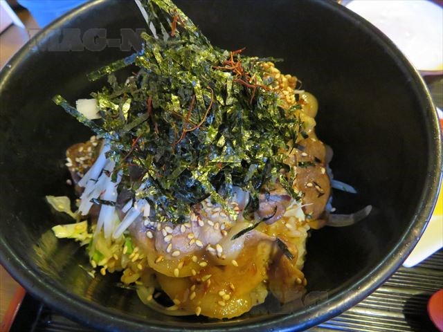 イノシシの肉を焼いて、ご飯の上に敷き詰めたものです。