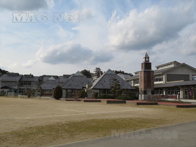 校門からは運動場を挟んでこれらの校舎を見え、その先の山の上にそびえる「大多喜城」をも臨むことができます。