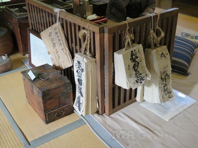 番頭が座るところの周りには、年季の入った歴代の大福帳が吊るされています。