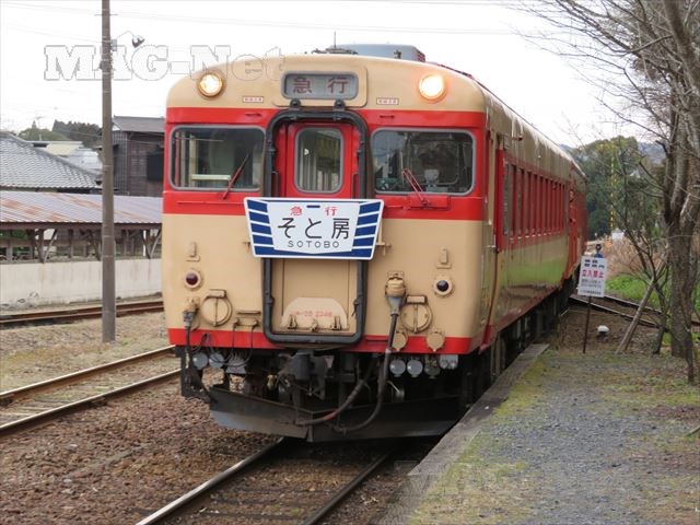 いすみ鉄道の急行列車は旧国鉄の車両を使って運行しており、肌色の車体に窓を赤のラインで描いた懐かしい姿です。