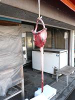 アンコウでしょか、赤っぽい魚が口を吊るされ、さばいたような跡が店先に残っています。