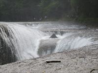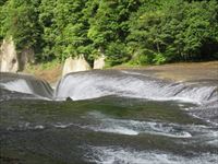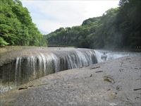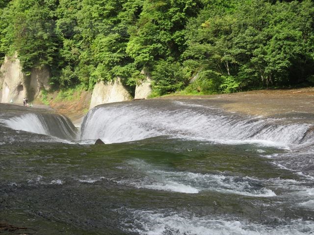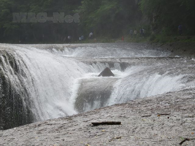 頭の上から落ちてくる滝ではなく、川の水が段差のある窪地に流れていく滝です。