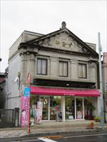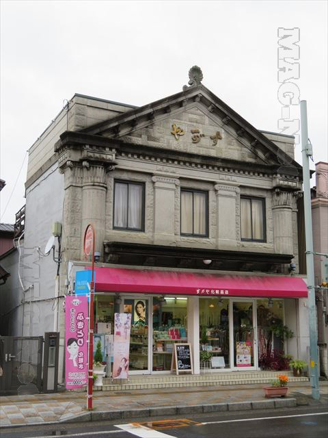 今は化粧品店になっており、柱建築やコリアント・イオニア様式風の柱飾りなど、洋風の香りが漂っています。