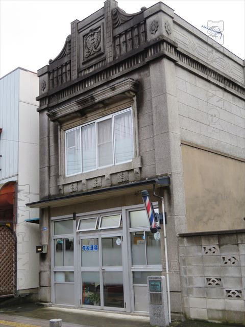 コンクリートの壁で固められた建物は、ここも例にもれず看板建築の「平松理容店」です。