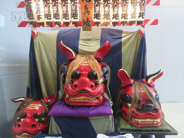 石岡駅には、祇園祭で使う赤い「館獅子」が飾られています。