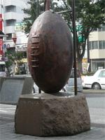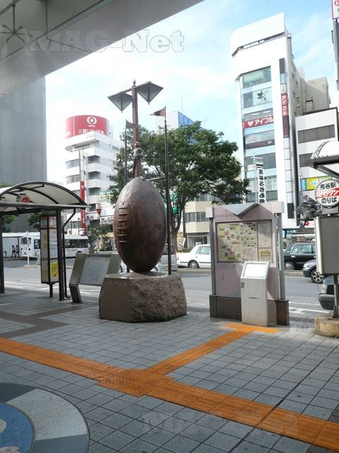 ラグビーの強豪校がしのぎを削っていた同市だけあって、駅のロータリーにはラグビーボールを模ったオブジェが飾られています。