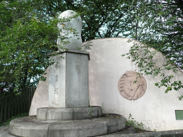 旧堤を下ったところには、蚕の繭を模った慰霊碑があります。