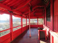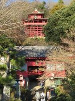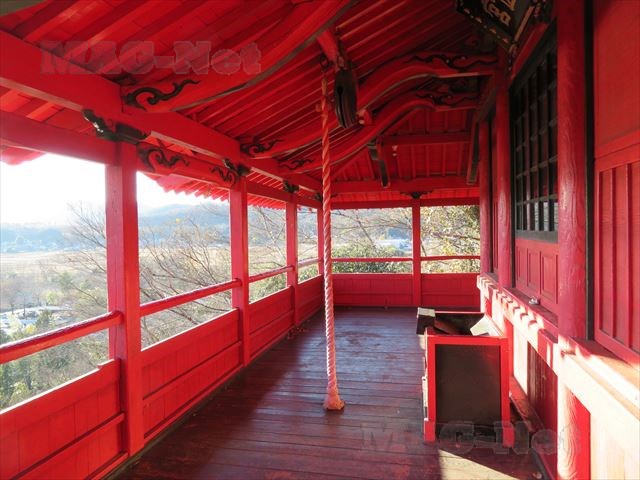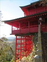 バス停に降りると、そこには山の中腹に真っ赤なお堂が見えます。