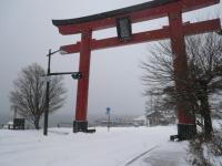 道路に架かる二荒山神社の朱色の大鳥居を目指して、滑らないようにへっぴり腰で進んでいきます。