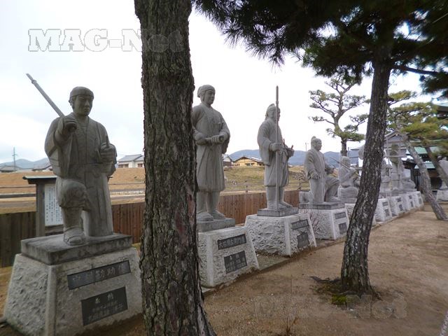 「赤穂大石神社」の鳥居の先には、赤穂四十七義士の石像が並んでいます。
