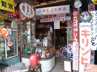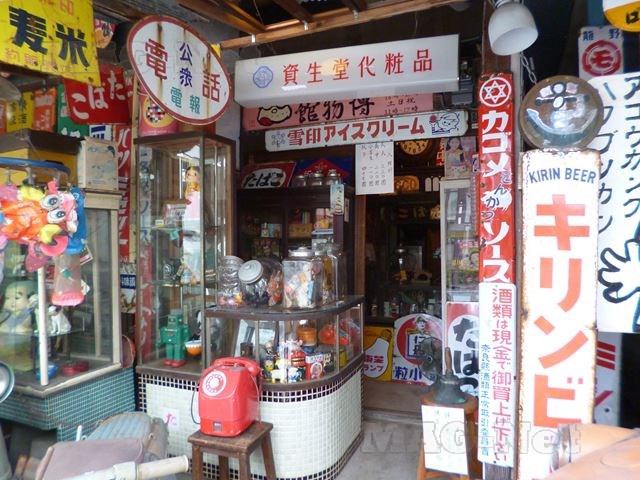 壁にはビール、醤油、足袋などの昔の看板が所狭しと並べ、入り口はタバコ屋の店頭を模っています。