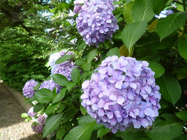 梅雨時期とあって、歩道には多くのアジサイが咲きほこっています。