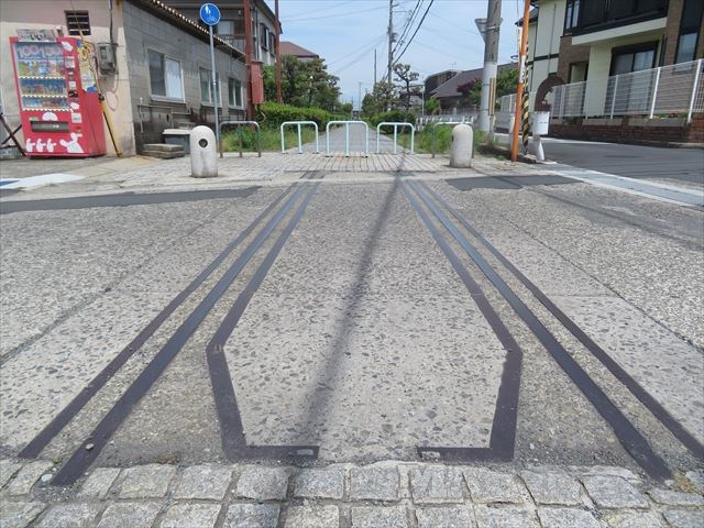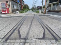 今ではレールの高さまで埋められて平らになっていますが、明らかに線路があったことが判ります。
