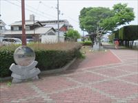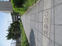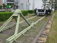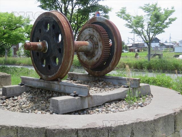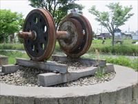 石碑の横には、ここもレールの上に乗った車輪がモニュメントとして造られています。