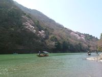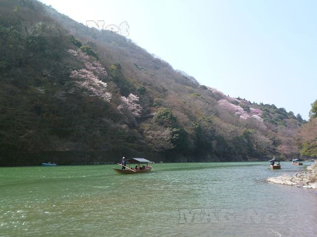 川の向こうの嵐山には、所々に桜の木がピンクに色付いており、きれいな光景が広がっています。