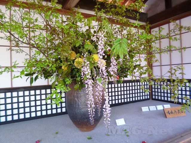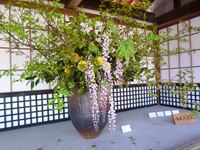 境内には、大きな鉢に豪快に活けられた嵯峨御流のいけばなが飾られています。