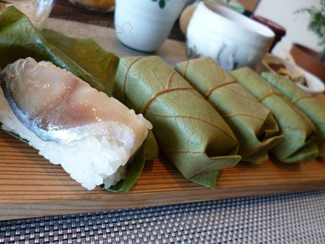 柿の葉っぱに包まれた握りずしは、鯖、海老、鮭、穴子、鯛をネタにした上品な味です。