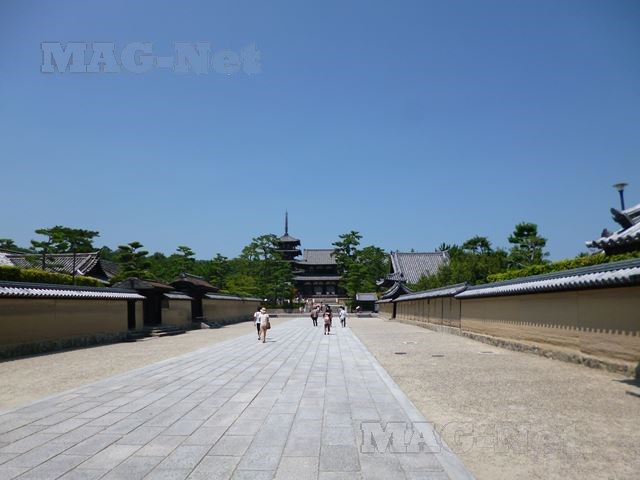 正面には「五重塔」そしてその隣に「金堂」、奥には「大講堂」が位置しています。