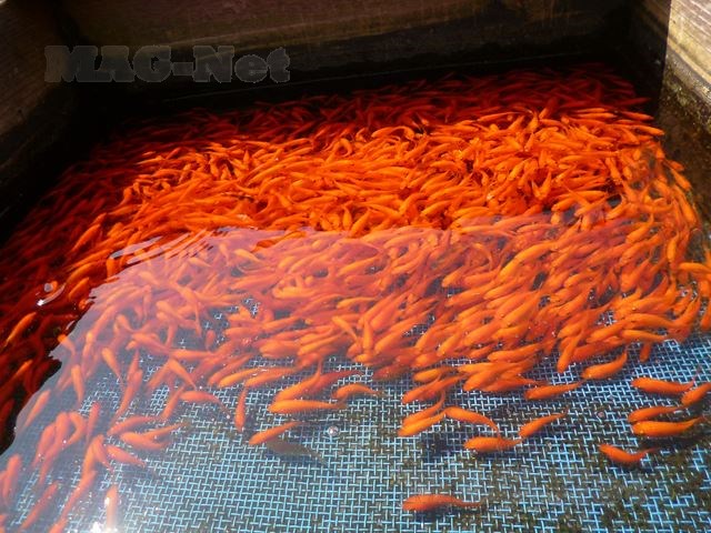一方外の水槽には、出荷を控えた小さな金魚が群れを成して泳いでいます。