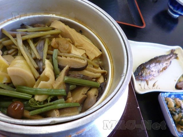 御釜にぜんまい、きのこ、たけのこがぎっしりと敷き詰められた釜めしは、予想以上に満足するものでした。