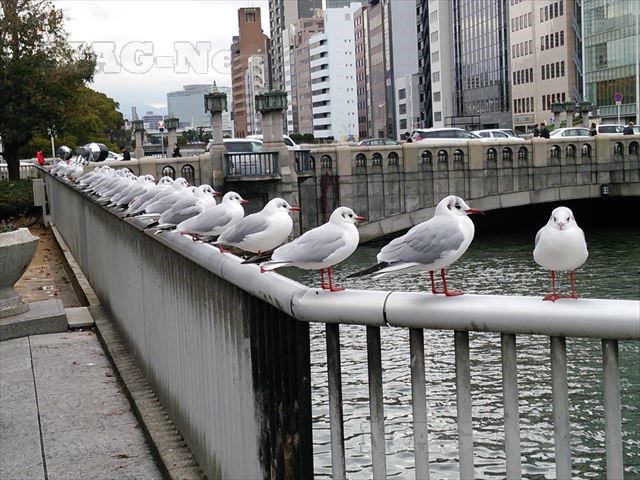土佐堀川の岸壁にはカモメが群れをなして飛来しており、海が近いことが判ります。