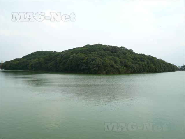 途中にある池の中で浮かんだ島ような古墳は、御廟山古墳です。