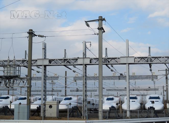 二重の柵で囲まれ入り口には警備員が見張っていますので近付くことができませんが、新幹線の先頭部分が横一列に並ぶ姿は見るだけでもワクワクします。
