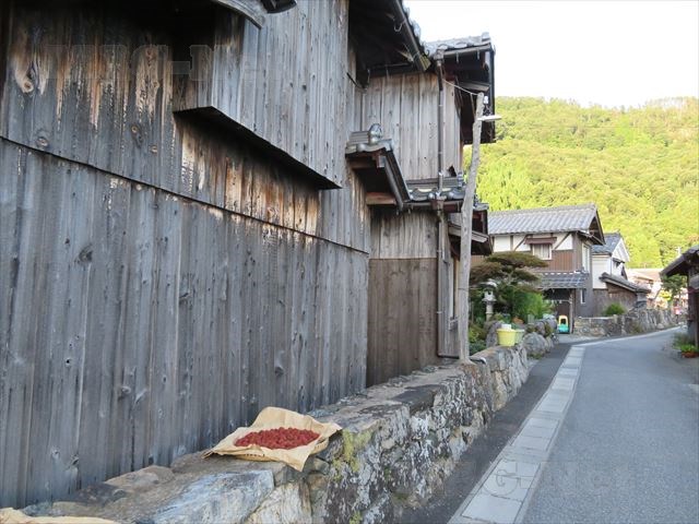 石垣の上には梅干用の梅が干されており、のんびりとした田舎の風景を味わうことができます。