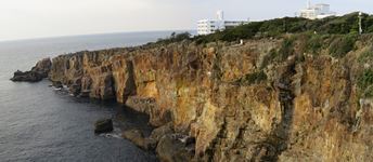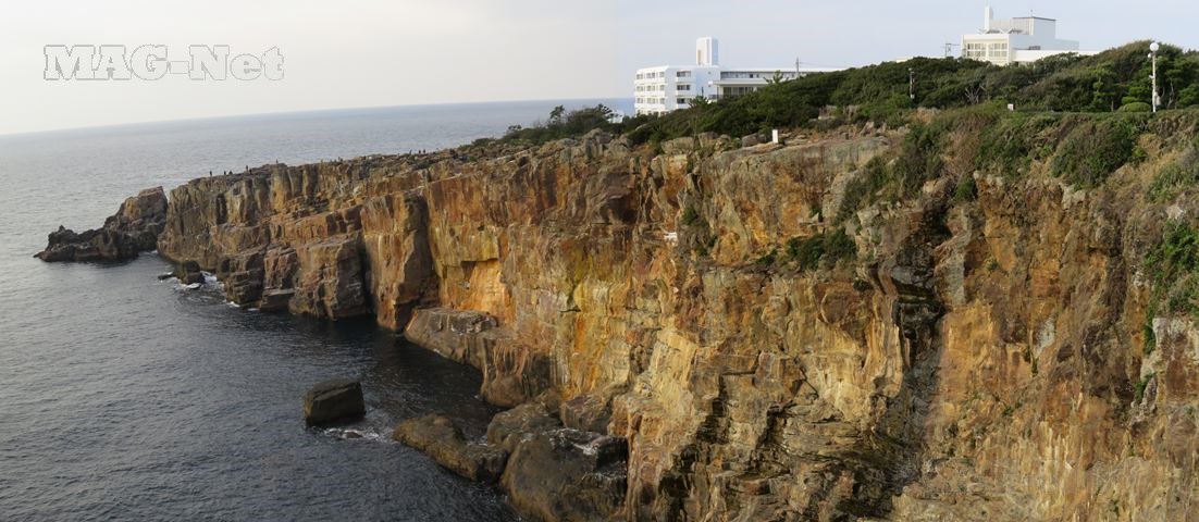岩場にぽっかり空いた洞窟があり、岩の上からは「三段壁」の断崖絶壁を眺めることができます。