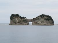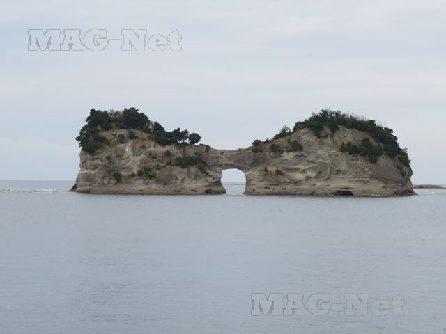 正式名称を「高嶋」といい、南北130m、高さ25mの島の中央は、浸食によって大きな穴が開いています。