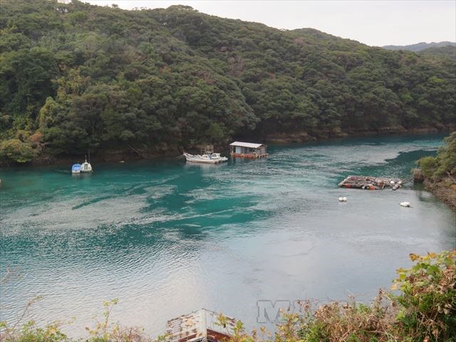 潮の流れは速いのですが、底まで覗けそうな澄んだ緑が広がっています。