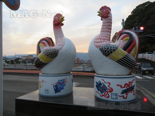 橋の中央には、陶器の夫婦鶏が飾られています。