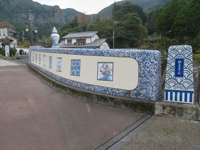 「鍋島藩窯橋」で、橋の欄干に伊万里焼の陶板がはめ込まれています。