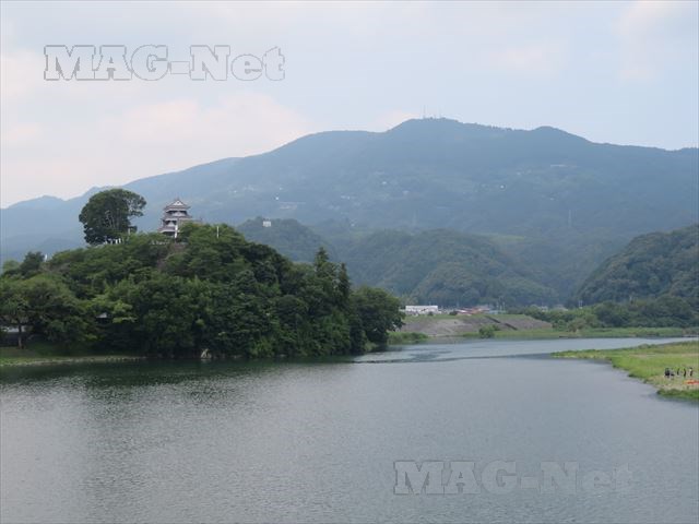 橋の上からは、川辺の高台の上にそびえている大洲城が見えます。