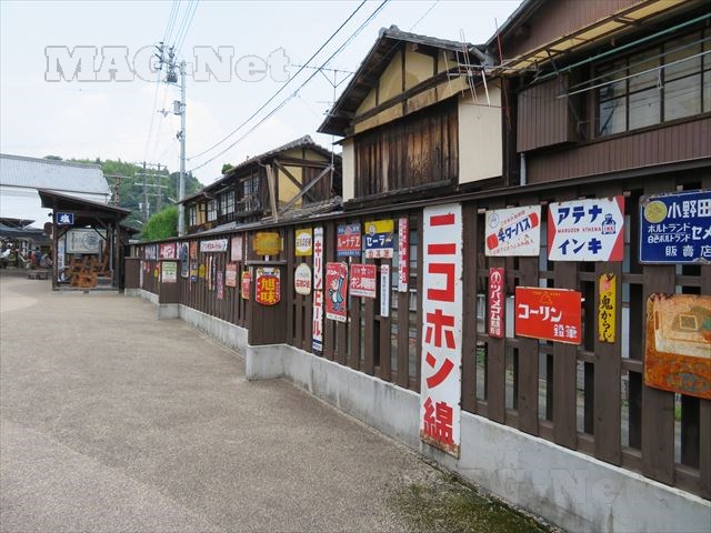 広場の塀に懐かしい看板がずらりと並んでいる場所があります。