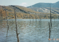 観光案内の写真によれば、丁度上高地の大正池のように池の中から枯れ木が・・ってのに引かれて来たのですが、例の枯れ木は女神湖の片隅にあるだけで、規模としては大正池の方が上です。