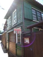 素朴な黒くくすんだ町家ばかりのこの町のなかで、異色の緑色の壁に疑いを持ちつつも、確かに〒マークの標識が付けられていることで、確かに郵便局であることに納得します。