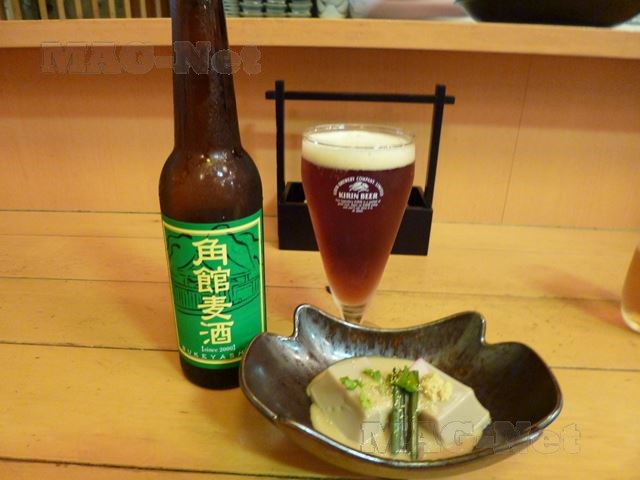 「角館麦酒」は黒ビールで、手作りのゴマ豆腐が合います。