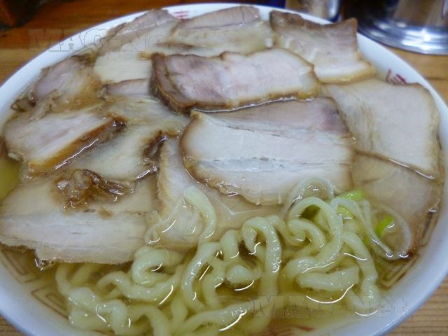 スープは塩味、麺は太麺の平打ち縮れ麺で、スープがなじんでいます。