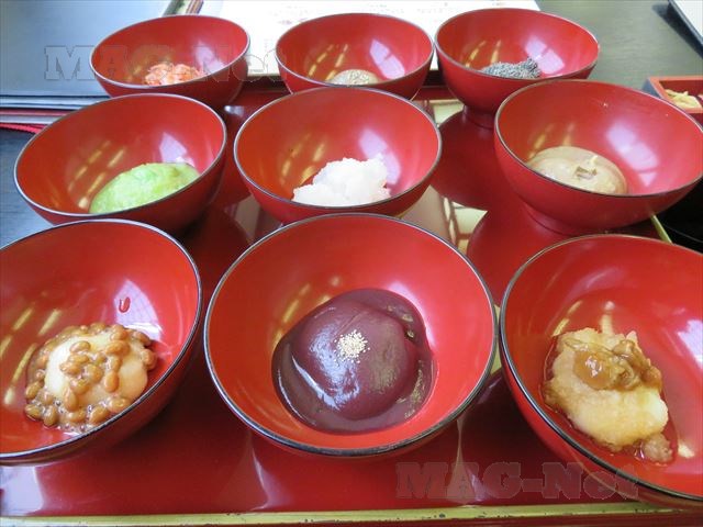 出てきたのは、9種類の餅のお椀と雑煮です。